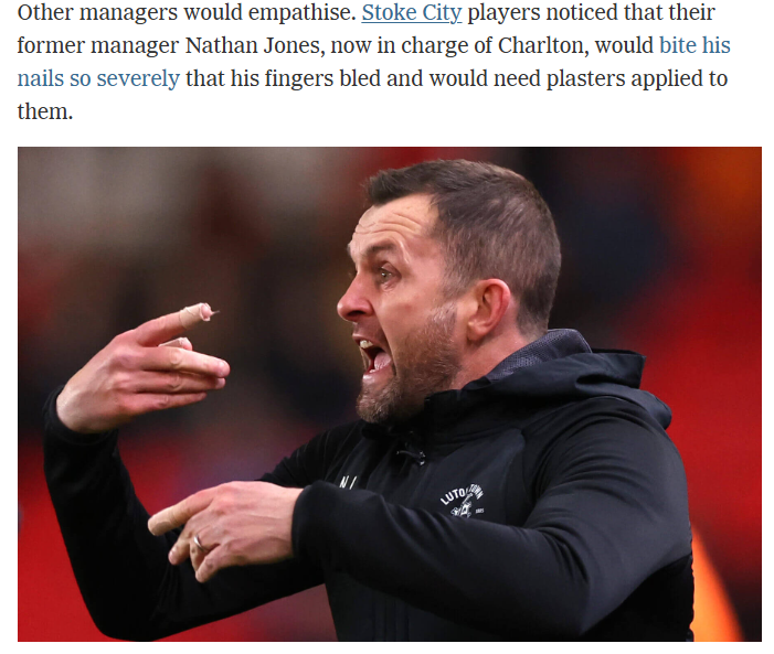 前斯托克城主帅、现在执教查尔顿的琼斯在压力大时会严重啃指甲,以至于他的手指都流血了,不得不全部缠上创可贴。